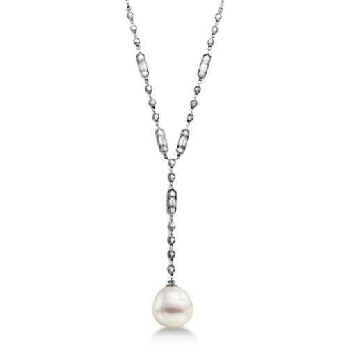 Une monture en or blanc 14K est titulaire D'une chaA®ne de diamants ronds entrecoupés avec 5 diamants baguette droite. le tout aboutissant A une perle des mers du Sud D'une crAšme lumineuse de couleur blanche et un éclat élevé.