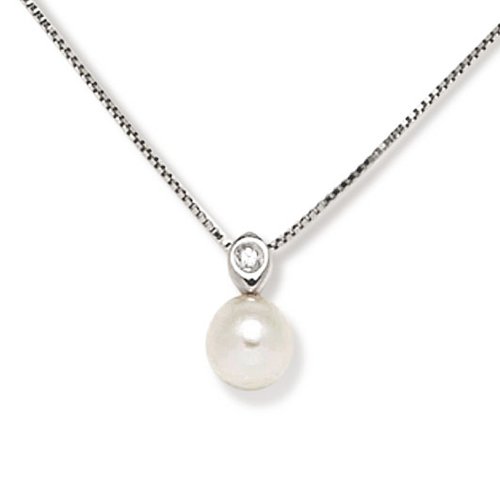 Perles Collier Femme en Or 18 carats Blanc avec Perle de Culture et Diamant H/SI, Cm 43, 2.4 Grammes