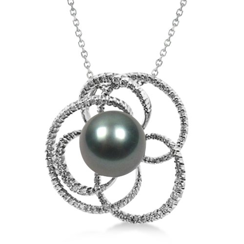 This mysterious black Tahitian pearl and diamond pendant sparkles with 112 diamonds of 0.50ctw. prong set in a 14K white floral design.